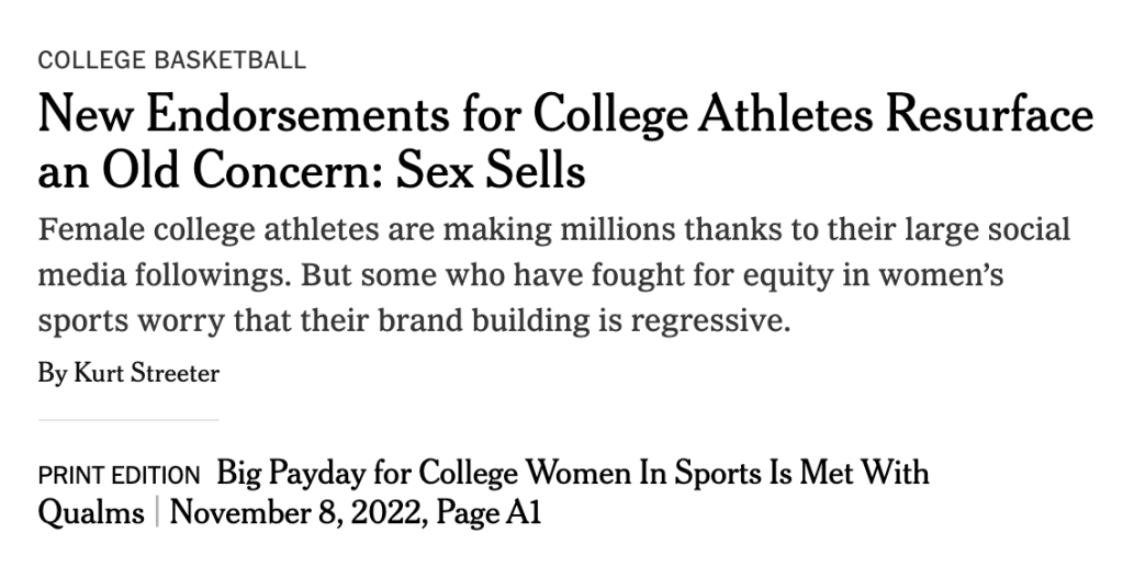 - Quoted in Streeter, K. (2022, November 8). New endorsements for college athletes resurface an old concern: Sex sells. New York Times. https://www.nytimes.com/2022/11/08/sports/ncaabasketball/olivia-dunne-haley-jones-endorsements.html?searchResultPosition=2