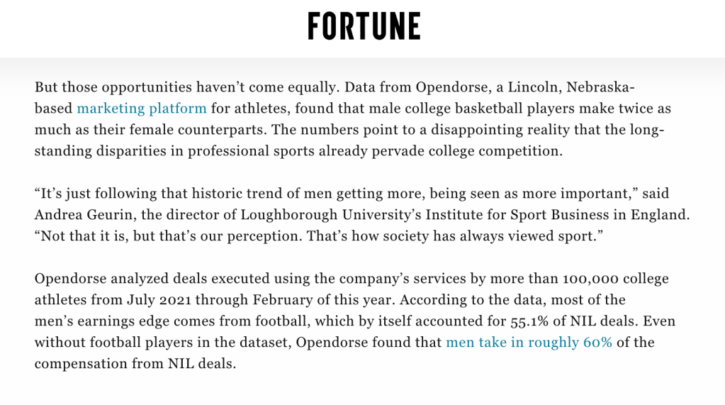 - Quoted in Wanna, C., (2023, March 16). Men make twice as much money as women under NCAA’s new rules that allow college basketball players to cash in. Fortune. https://fortune.com/2023/03/16/how-much-do-college-basketball-players-make-ncaa-men-twice-as-much-women-nil/